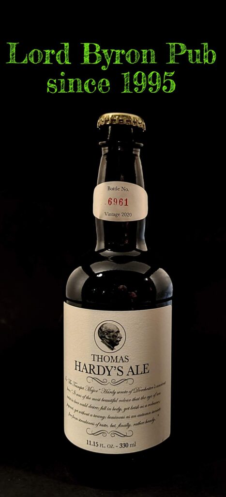 Poche birre al mondo possono vantare la fama quasi mitologica che avvolge la Thomas Hardy’s Ale. Forse non tutti sanno che la Thomas Hardy’s Ale è dedicata ad un famoso scrittore, Thomas Hardy appunto (1840-1928), di cui riporta l’effige sulla bottiglia. Il noto letterato britannico era amico della famiglia Pope, che nel 1870 affiancò gli Eldridge nella proprietà del birrificio Eldridge Pope, fondato a Dorchester nel 1828 da Sara Eldridge. Pare che il signor Hardy fosse un vero appassionato di birra, in particolare delle strong ale locali. Va da sé insomma che alla Eldridge Pope si sentissero quasi in dovere di creare una birra in onore dell’illustre amico di famiglia. Ecco che la Thomas Hardy è fatta interamente con malti pale ale e deve il suo colore sia alla sua densità che alla caramellizzazione in bollitura. Durante la produzione viene aggiunto lievito svariate volte, sia in fermentazione che nei tre mesi di maturazione. Almeno metà della maturazione viene fatta a temperatura ambiente, dopodiché la birra viene raffreddata per far precipitare il lievito in sospensione. Non è filtrata né pastorizzata, e non viene aggiunto né materiale fermentabile né lievito in bottiglia.